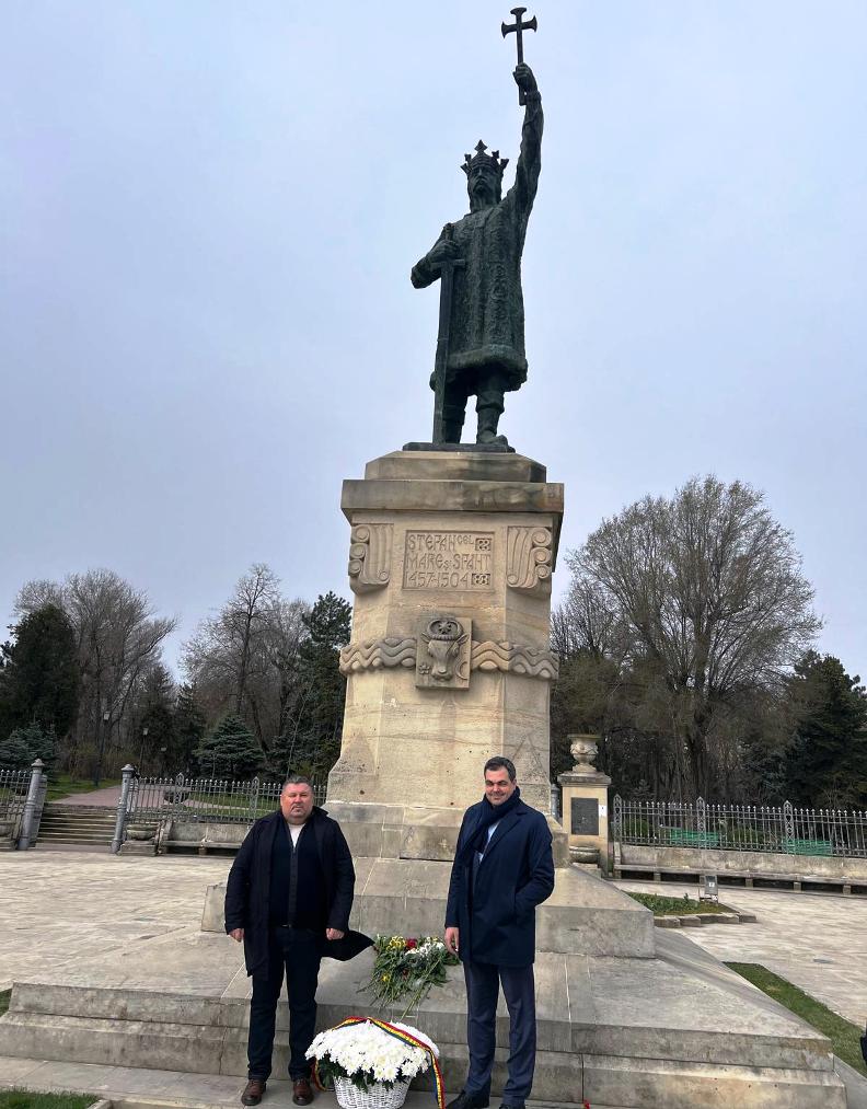 Acasă / Știri de actualitate UNBR  / 106 ani de la Unirea Basarabiei cu România: Consilierul Municipiului Chișinău, Marian Bucataru (avocat în Baroul Maramureș și membru al Uniunii Avocaților din Republica Moldova), împreună cu Decanul Baroului Maramureș – Avocat Florin Andreicuț, au depus la statuia marelui conducător al Moldovei, Ștefan cel Mare și Sfânt, un coș cu flori, pentru a marca evenimentul