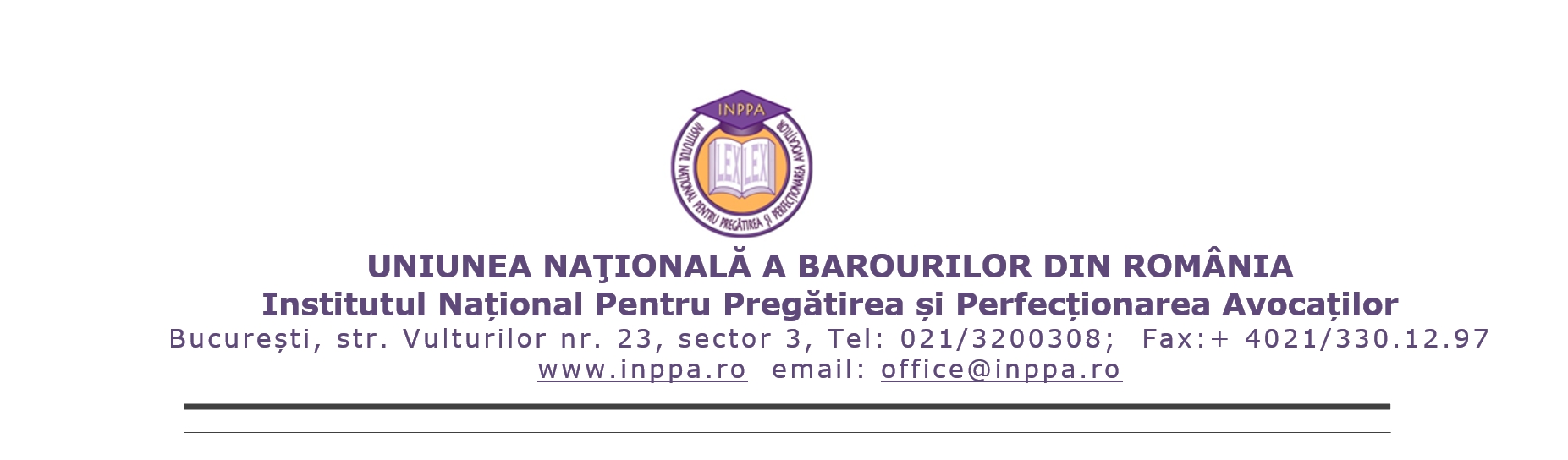 În conformitate cu prevederile art. 10 alin. (3) din Regulamentul privind organizarea și desfășurarea examenului de absolvire a Institutului Naţional pentru Pregătirea şi Perfecţionarea Avocaţilor – I.N.P.P.A.,