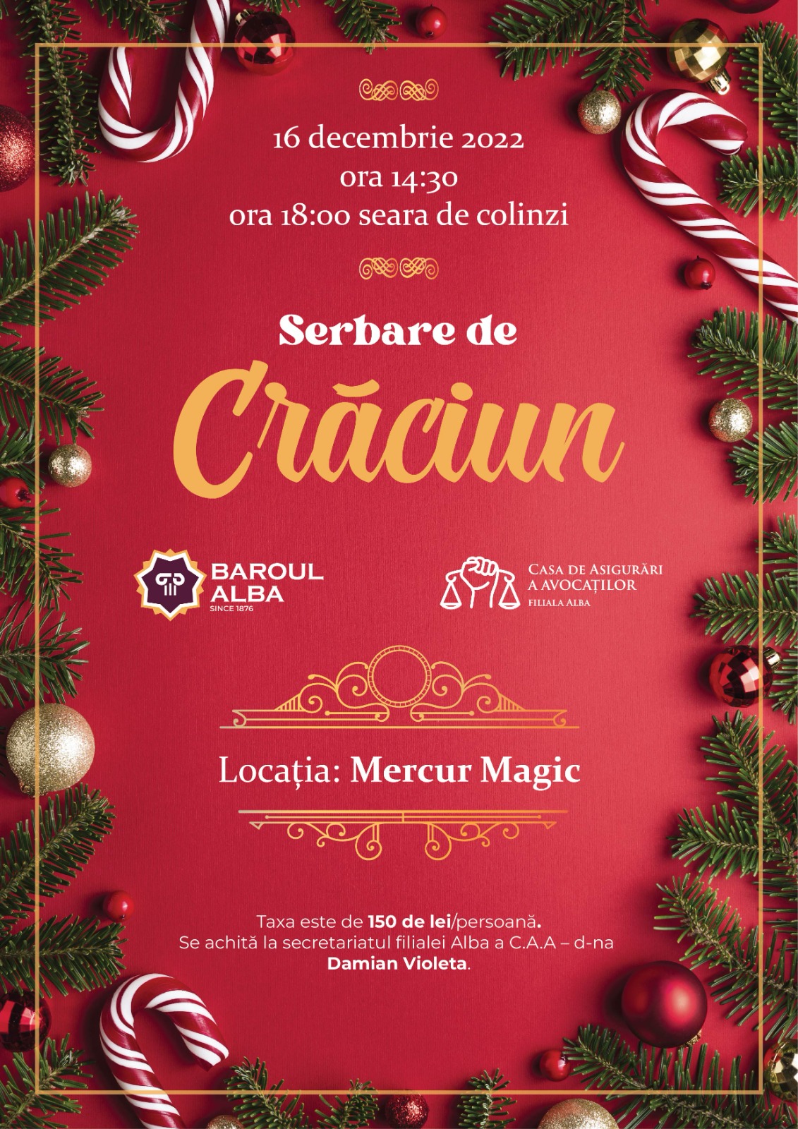 Baroul Alba împreună cu Casa de Asigurări a Avocaților vă invită în data de 16 decembrie 2022, începând cu ora 14:30. Locația este Mercur Magic, iar taxa va fi de 150 lei/persoană care se pot achita la dna Violeta Damian.